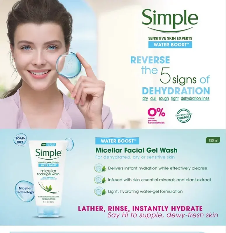 میسلار ژل شستشوی صورت سیمپل مدل Water Boost، نسل جدیدی از محصولات مناسب شستشوی صورت است. این محصول، آبرسانی فوری و پاکسازی ملایم و در عین حال موثری را ارائه می دهد. بافت این ژل به شکلی است که روی صورتتان به آرامی می لغزد و آرایش و کثیفی را پاک و در عین حال پوست شما را خیلی سریع شاداب میکند.